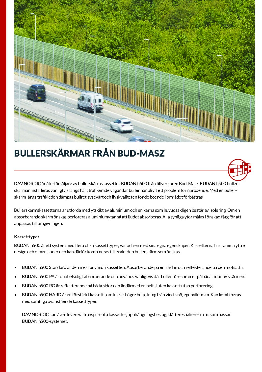 DAV NORDIC är en distributör av BUDANh500 kassetter /bullerskärmar från tillverkaren Bud-Masz. BUDAN h500-bullerskärmar placeras vanligtvis längs trafikerade vägar/järnvägar, där buller blivit stora problem för de boendena i närområden. Med en absorberande bullerskärm längs vägen så kommer buller och oljud att dämpas betydligt, vilket ökar livskvaliteten för de boendena. Skärmarna består av aluminium ramar, lackerad i valfri RAL färg med ett speciell antigraffiti skydd och en kärna av isolering. Finns i flera olika utförande.