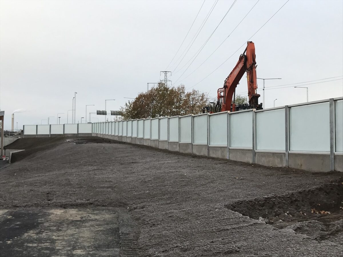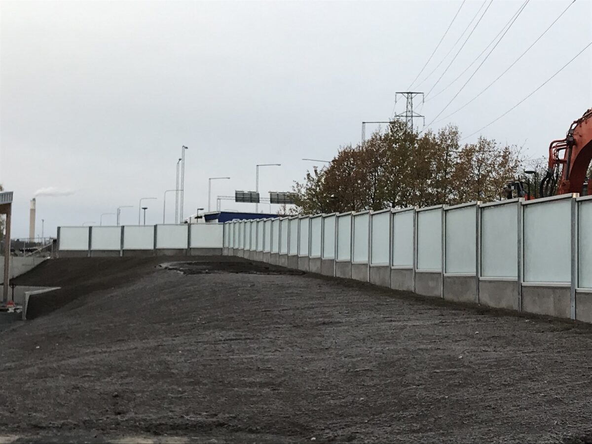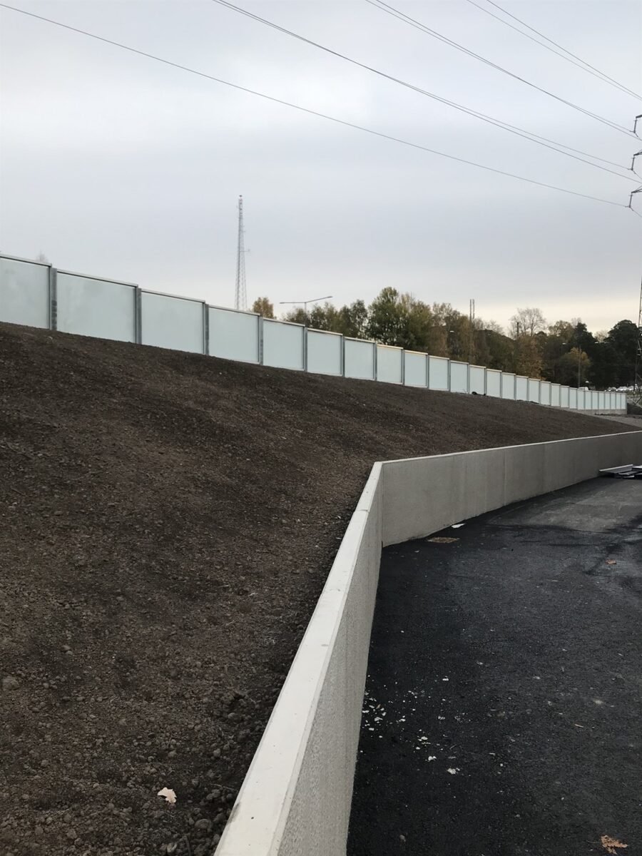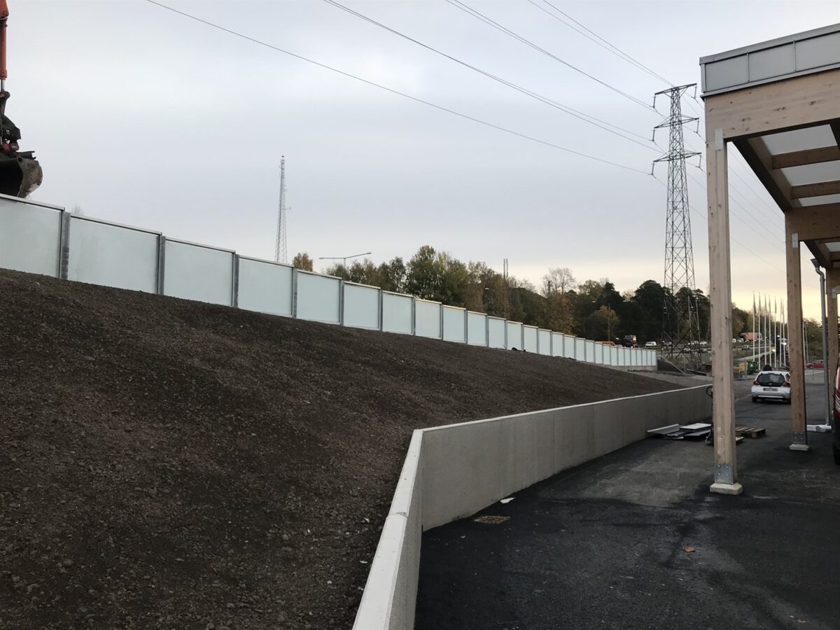 En ny handelsplats växer fram i Sköndal där vi fått förtroendet att leverera transparant riskskärm/bullerskärm på en sträcka av ca 90 meter med en skärm höjd på ca 2 meter.