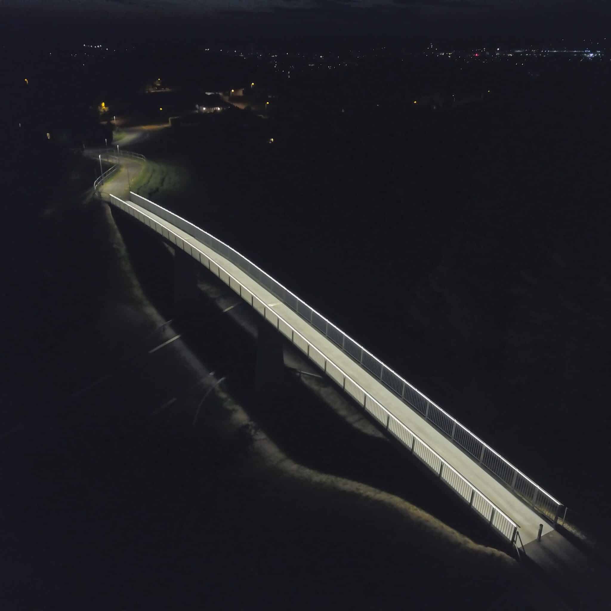 Vi har till Gullev vid Bjerringbro levererat ett specialräcke med integrerad belysning i handledaren, det vill säga den övre genomgående plattan. Bron uppfördes för att säkerställa en smidig passage för gående och cyklister över en trafikerad väg. I detta fall färdigmonterades hela bron under en enda natt, där stora delar av räcket monterades på fabrik och de sista elementen färdigställdes efter att bron monterats.